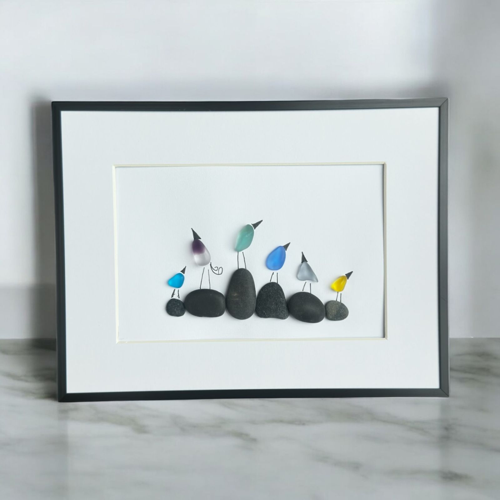 Sinta a alegria do amanhecer com este charmoso quadro artesanal da Tuca Lenzi. Uma cena singela e encantadora de seis passarinhos coloridos, delicadamente criados com pedras naturais, reunidos sobre suas "pedrinhas" de pouso. Cada pássaro exibe uma cor vibrante e uma postura curiosa, como se estivessem a compartilhar os primeiros raios de sol e os sons da natureza.